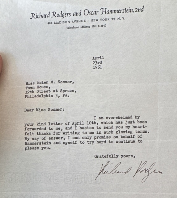 TLS – Typewritten Letter Signed, one page, 23 April 1951. Written to a young admirer. Reads: I am overwhelmed by your kind letter of April 10th, which has just been forwarded to me, and I hasten to send you my heartfelt thanks for writing to me in such glowing terms. By way of answer, I can only promise on behalf of Hammerstein and myself to try hard to continue to please you. Letter accompanied by a 8″x10″ black/white glossy newspaper publicity still.